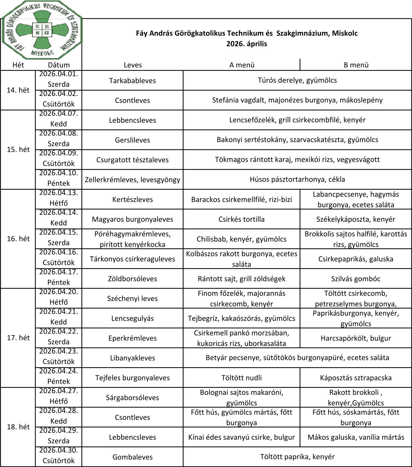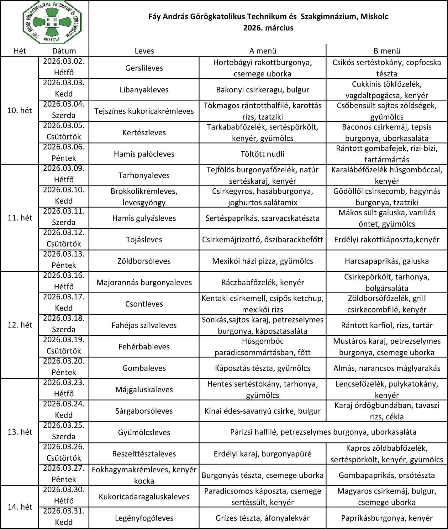 Az étlapváltozás jogát fenntartjuk! Az étrend glutént, tejet, tojást, szóját, földimogyorót, dióféléket, szezámmagot, halat, zellert, mustárt, kén-dioxidot tartalmazhat. Intézményünk diétás étkezést igénylő tanuló (orvos által igazolt) számára diétás étkezést tud biztosítani!